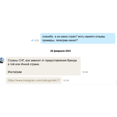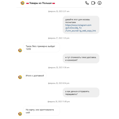 Доставщик не внушает доверие: нет отзывов, в разговоре не была раскрыта цена и комиссии. Активность инстаграм слабая. Обратная связь в течение дня.